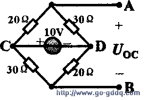 (2)求输入电阻Rab,如图所示,恒压源被短接后,C、D成为一点,电阻R1、R3和R4分别并联后相串联。即:R0=Rab=20//30+30∥20=12+12=24Ω。