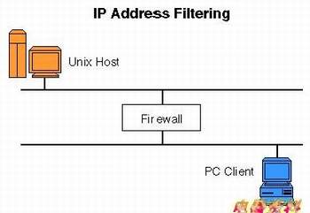 所有的防火墙都具有IP地址过滤功能。这项任务要检查IP包头,根据其IP源地址和目标地址作出放行/丢弃决定。看看下面这张图,两个网段之间隔了一个防火墙,防火墙的一端有台UNIX计算机,另一边的网段则摆了台PC客户机。