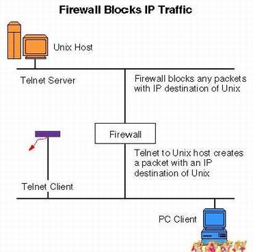 现在我们“命令”(用专业术语来说就是配制)防火墙把所有发给UNIX计算机的数据包都给拒了,完成这项工作以后,“心肠”比较好的防火墙还会通知客户程序一声呢!既然发向目标的IP数据没法转发,那么只有和UNIX计算机同在一个网段的用户才能访问UNIX计算机了。