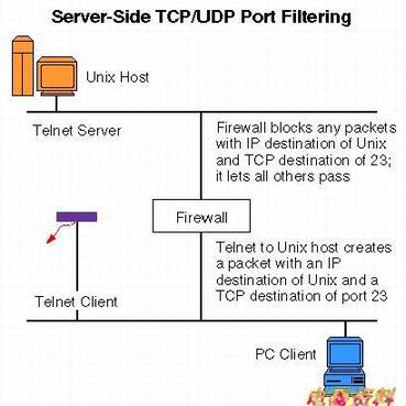 比如,默认的telnet服务连接端口号是23。假如我们不许PC客户机建立对UNIX计算机(在这时我们当它是服务器)的telnet连接,那么我们只需命令防火墙检查发送目标是UNIX服务器的数据包,把其中具有23目标端口号的包过滤就行了。这样,我们把IP地址和目标服务器TCP/UDP端口结合起来不就可以作为过滤标准来实现相当可靠的防火墙了吗?不,没这么简单。