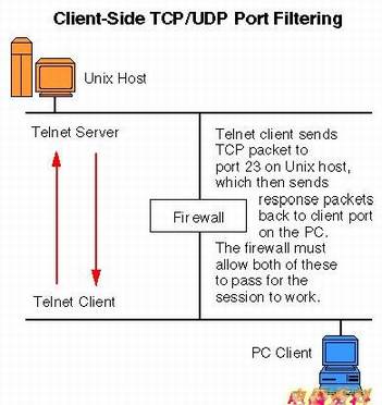 当PC客户机向UNIX计算机发起telnet请求时,PC的telnet客户程序就产生一个TCP包并把它传给本地的协议栈准备发送。接下来,协议栈将这个TCP包“塞”到一个IP包里,然后通过PC机的TCP/IP栈所定义的路径将它发送给UNIX计算机。在这个例子里,这个IP包必须经过横在PC和UNIX计算机中的防火墙才能到达UNIX计算机。