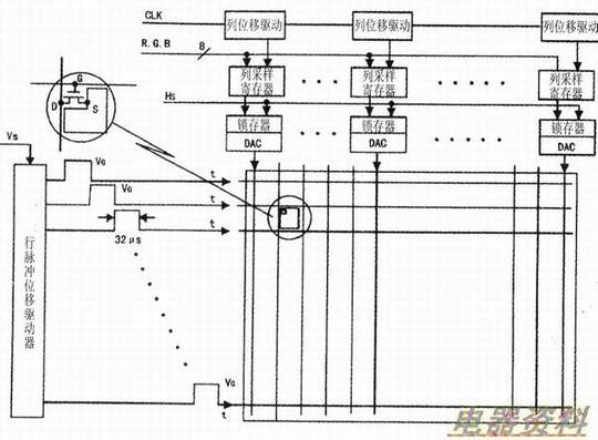 我们知道,液晶显示屏中列线数量就是每一行像素的数量。然而每一列像素中TFT的漏极都连在同一条列(Y)线上。由此可见,屏幕上每个像素的寻址可通过行(x)线和列(Y)线的“坐标”确定。既然行(x)线靠外加矩形脉冲的逐行位移将一行一行的像素逐行同时接通,那就要求每一行TFT接通之前,该行所有列(Y)线上的信号电压(模拟量)必须到位,然后与行位移脉冲同步地同时加到所有的列(Y)线上,并保持一个行周期时间,待行位移到下一行时,所有列线上信号电压也同时刷新。