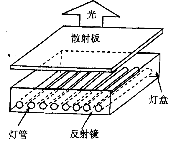 反射式的基本结构如上图所示。它由数据平行排列的冷阴极荧光灯管组成,底背面的反射板可增加亮度,正表面有漫散射板有利于表面亮度的一致性,目前多用于大型和需要高亮度的场合。