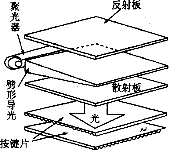 侧面导光式的基本结构如下图所示。位于侧面的冷阴极荧光管发出的光经聚光器聚光后射向导光板,导光板做成楔形,利用光导板两面对光的折反射,使光一方面导至光导板的末端,另一方面均匀地从两边射出,为增加正面光强度。背面设置了反射板,正面设置了散射板和棱镜板,以便获得高亮度和均匀的平面光源。几乎所有笔记本PC和大屏幕显示器使用它为背光源系统。