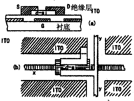 在当前大屏幕有源矩阵式中,首选的是a—Si(不搀杂或轻搀杂的非晶硅)半导体场效应三端口器件,如下图(a)所示。a—Si场效应是利用表面效应的绝缘栅做成场效应晶体管,它通常由不搀杂或均匀轻搀杂的高阻半导体a—Si与同一侧表面相接触的绝缘层组成。有D、S、G三个电极。因为不搀杂a—Si薄膜本身的很高,是不导电的。当栅极上加正,吸引电子在界面处堆积,形成N型沟道,源漏间导通;如果栅极上加负电压,电子被推走,空穴(带正电)在界面上堆积,形成P沟道,源漏之间也导通。不过方向相反,ITO电极板上的充电符号相反。换句话说:显示屏中每一个的TFT都相当于一个电子开关,栅极不加电压时,a—si沟道很大,源、漏极之间相当于开路;栅极加电压时,a—si沟道导通,a-si沟道很小,源、漏极之间相当于接通,其电流的通断比高约7个数量级。接通时,漏极(信号)电压对像素极板(ITO)充电,不同像素的信号电压不同,像素极板上充电电压不同,液晶分子扭曲型排列的“破坏”程度不同,透光度不同,实现了对单色像素的亮度,以及彩色的调制;关断(开路)时,已充电的像素极板上电荷不会消失,每个像素的辉度能保持(储存)相对长的时间,直至第二次接通电刷新。
