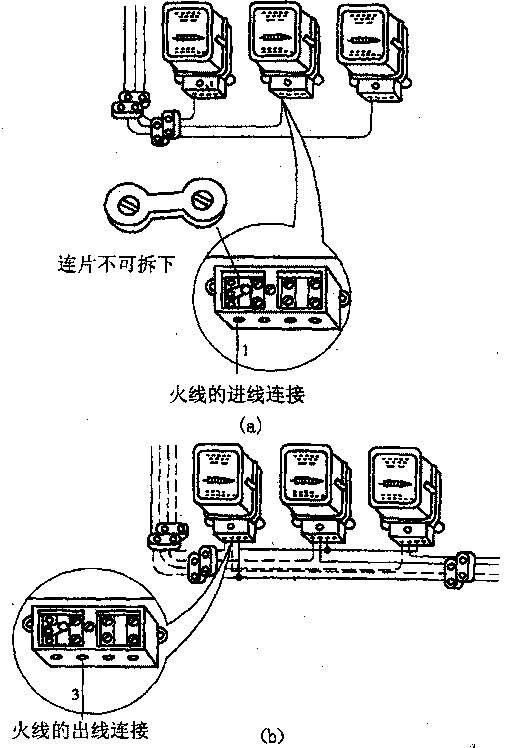 单相与三相四线制的配接安装及接线如图所示。按此方法可使得电力负荷分配较均匀。下图(a)为三只单相电度表分别接入三相A、B、c的示意图。下图(b)为三只单相电度表分别引出线连接示图。