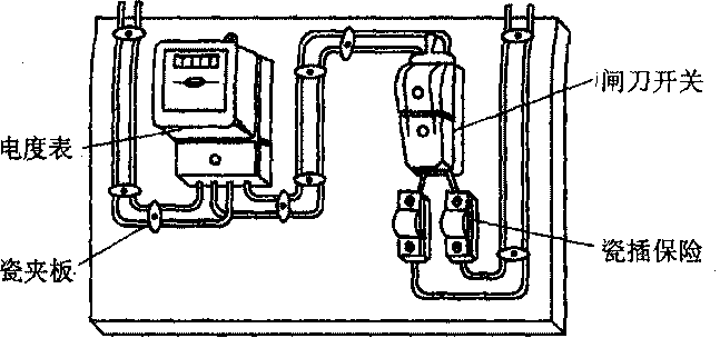 单相板面的安装及板前的布线,如图所示。电度表布线可用明线或暗线,瓷插保险也可装在电度表前线路中,电度表用闸刀上的保险丝来保护侧短路。