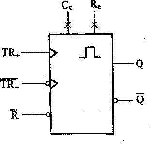 (1)单稳态符号如下图所示。单稳态触发器一般具有两个触发端:上升沿触发端T艮和下降沿触发端TR;具有两个输出端:Q端和Q端,其输出信号互为。另外,还具有清零端R,外接端Re,外接端Ce。在单稳态触发器TR端输入一个触发脉冲,其输出端即输出一个恒定宽度的矩形脉冲,该矩形脉冲的宽度由外接定时元件Re和Ce的大小决定。下表为单稳态触发器真值表。
