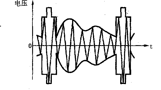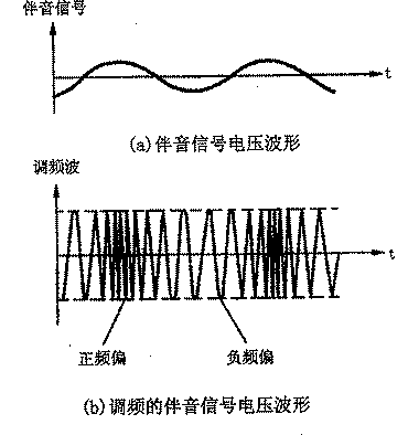 我国选取的伴音载频(fs)比图像载频(fp)高6.5MHz,即:fs=fp=6.5MHz。当伴音信号电压为零时,调频信号的为fs;当伴音信号电压为正时,调频信号的频率大于fs,即产生正的频偏,而且伴音信号电压的大小与频偏成正比:当伴音信号的电压为负值时,调频信号的频率小于fs,即为负的频偏,且伴音信号电压的大小与频偏成正比。下图是调频的伴音射频信号电压波形示意图。