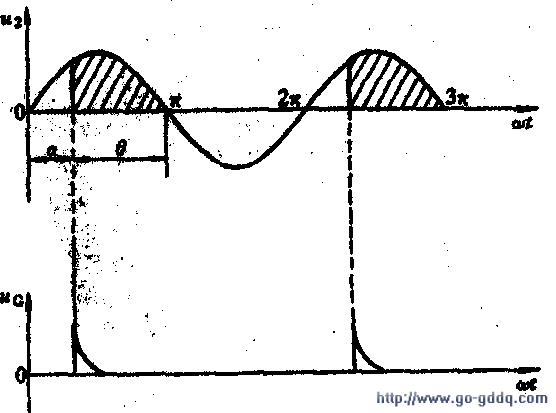 从下图所示单相半波可控的波形来说明,U2为电压波形,当晶闸管承受电压正半周某一时刻,假设在电角度a时刻,给管子加上触发脉冲Ug,这时晶闸管立刻从阻断转为导通,此导通一直维持到电源电压过零变负那一时刻,晶闸管自动关断,下一个重复前面的过程。从电源U2过零变正到管子被触发导通这段时间折合成电角度a。称为延迟角(曾称控制角)。把晶闸管导通持续的时间折合成的电角度θ,称为导通角,并且:θ=π-α。