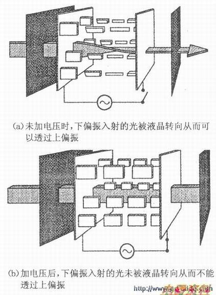当在液晶层上加入后,液晶分子排列方向就与电场方向平行,液晶的旋光特性消失,进入上层偏光板光线的偏振轴与板的偏振轴正交,光线被阻断,如图1(b)所示。加入电压不同,就可以改变(调制)液晶板的透光率,实现图像的亮度调制。