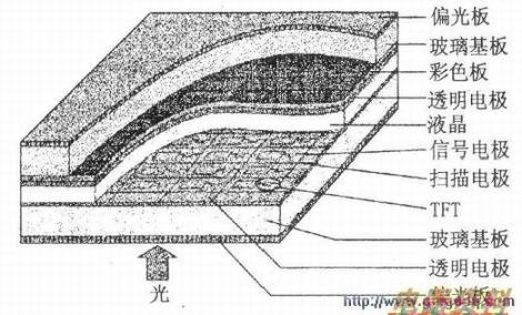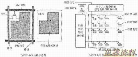 上图给出了薄膜(TFT-LCD,Thin-FilmTransistor-LiquidCrystalDisplay)面板的结构示意图。下图给出了TFT-LCD结构示意图和驱动原理图。LCD显示器利用MOS场效应晶体管作为开关器件,MOS场效应晶体管的栅极接扫描电极的母线,相当于水平方向的寻址开关信号电极,源极接信号线,相当于垂直方向激励信号输入端,漏极通过存储接地。当MOS场效应晶体管的栅极加入开关信号时,水平方向排列的所有晶体管的栅极均加入开关信号,但由于源极未加信号,MOS晶体管并不导通。只有当垂直排列的信号线上加入激励信号时,与其相交的MOS场效应晶体管才会导通,导通对被寻址的存储充电,电压的大小与输入的、代表图像信号大小的激励电压成正比。电视图像信号通过源极母线依次激励(接通)MOS场效应晶体管,存储电容依次被充电。存储电容上的信号将保持一帧时间,并通过液晶像素的逐渐放电。与此同时液晶将出现动态散射,并呈现出与存储电容上的信号电压相对应的图像灰度。