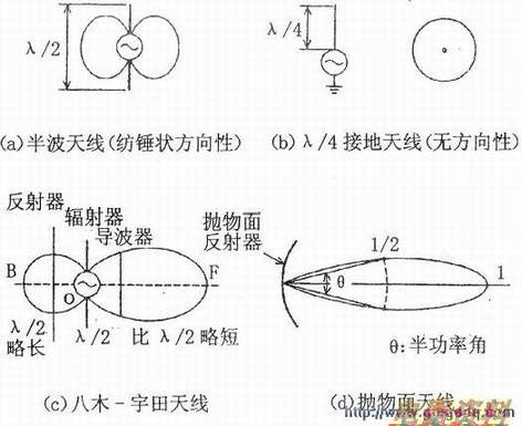 下图(c)所示的八木一宇田天线是在半波天线的前方增设了一个称为导波器的略短于λ/2的导体,后方增设了一个称为反射器的略长于λ/2的导体而构成的,具有指向导波器前方的方向性。