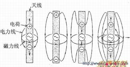 下图所示是天线辐射电波的情形。当给半波长天线导体的中点加上高频()时,导体上就会有高速往复运动的正电荷和负电荷。电荷移动产生电力线和与之正交的磁力线。于是,伴随着电荷的往复运动,电力线和磁力线便成为闭合曲线而被推挤到空间中去。