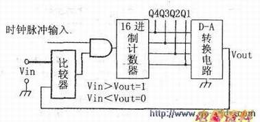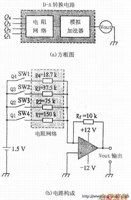 因为数字的表现不是1就是0,因而可用模拟开关来代替它。所以,可以用二进制输入来打开、关闭开关,并经适当的连接到加法器。加法器进行与计数量相符(依靠定标)的运算,而得到与二进制输入相当的模拟电压。这里的加法器用的是运算放大器。其具体的电路构成如下图(b)所示。