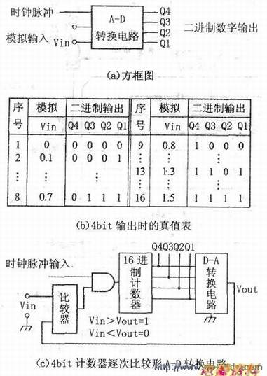 将模拟量变换为数字量的称为A-D转换电路,A-D转换电路是要获得与模拟输入成比例的数字输出的电路。下图(a)是其方框图。因为要进行数字控制,因而有一个时钟脉冲输入端。图中Vin是输入,输出为0000~1111的二进制4位。