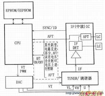 在接收到图像信号的同时,图像中放中的AFT也输出呈S形曲线变化的电压(变化范围一般是0—4.5V)送到CPU的AFT输入端,经CPU内部转换成相对应的数字信息后,触发CPU发出存台指令。当调谐到高频头输出准确的38.00M图像中频时,AFT输出电压正好对应S形曲线的中点(约2.5V,为CPU供电电压的一半),CPU被该电平触发,立即通过I2c总线或片选CS端向E2PROM发出存台指令,把当前的调谐电压、波段信息、AFT电压、频道号、制式等数据,存储在E2PROM中,同时电视屏幕显示的频道号自动向前加1,继续搜索下一个电台节目。