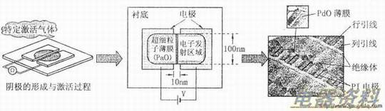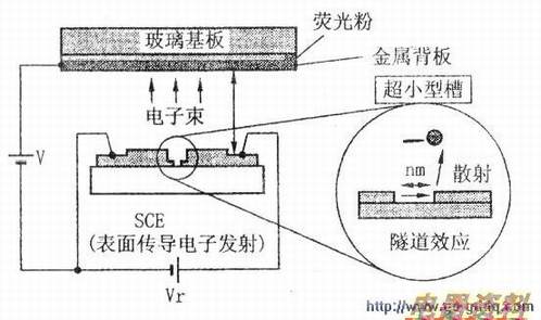 SED的前玻璃板上涂有红、绿、蓝三色荧光粉并作为阳极,相对后玻璃板加有几千伏的高压。通过丝网印刷法在后玻璃基板上制作对应每个的金属电极,并用喷墨印刷的方法在金属极间制作氧化钯薄膜电子发射阴极。SED的阴极是平面阴极,其电子发射是通过隧道效应的机理来完成的。当金属电极间加上十几伏的电压后,极间将形成超高强度的电场,氧化钯膜中的电子会被牵引出来,形成电子发射。