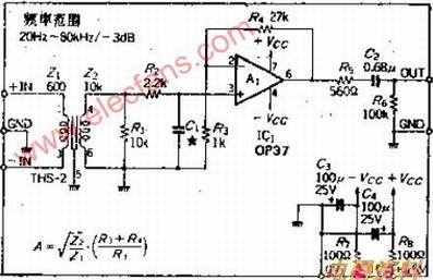 OP放大器的共模抑制比很大,可以很容易制作平衡输入电路。但这种电路往往会出现共模抑制比随频率增高而下降的现象,这样就很容易受高频噪声的影响。这里提供的电路,采用了平衡变压器控制共模抑制比,放大电路作为一种普通的不倒相电路使用。