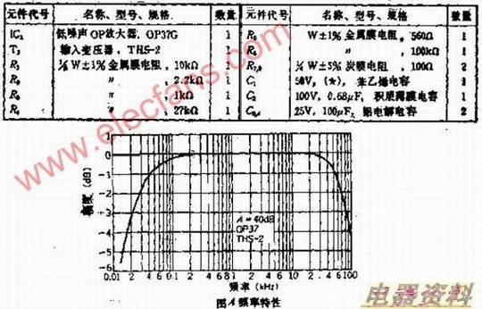 R2、C1是抑制高频噪声的低通,对高频的抑制作用取决于C1,C1可用R2加上等效输出求出。OP放大器使用了闭环频率良好的低噪声型OP37,直流耦合。如果使用补偿电压高的OP放大器,R3应串接一个数十微法的。