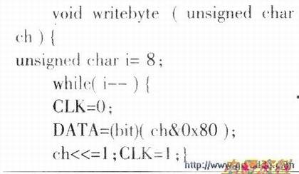 (2)软件实现SPI接口51系列单片机没有硬件SPI接口,因此必须用软件模拟SPI接口读、写外部数据。写1字节的程序如下: