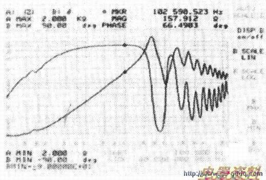 下图显示10英寸低音扬声器用于最初试验的抗。音圈是用玻璃纤维做的一个不导电的线圈架绕制的2层绕组。音圈电感的相移最多只有67度,明显说明在此磁性系统里出现的涡流问题。以大约500千赫阻抗的顶峰发生随后有一系列共振,这是磁性系统里的杂散所引起的。