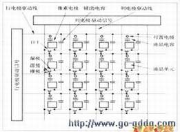 把液晶显示屏的水平(X)一组的显示像素的背电极(TFT薄膜晶体管的栅极)连在一起引出,称为行电极,该电极上通常施加的是扫描驱动信号。把纵向 (Y)一组的显示像素的段电极 (TFT薄膜晶体管的源极)连起来一起引出的,被称为列电极,该电极上通常施加的是数据驱动信号。显示屏上的每一个像素的扭转和状态都是行电极和列电极交叉汇合控制的结果,这样通过行信号和列信号的不同组合,就可对每个像素进行控制,进而控制特定像素的扭转。其等效电路如右图所示。在驱动方式上 采用了类似于CRT的光栅扫描方式,通过循环地给行电极施加选择脉冲,同时为有显示数据的所有列电极给出相应的选挥或非选择的驱动脉冲,从而实现某行所有显示像素的显示功能。这种行扫描是逐行顺序进行的,循环很短 (高达几十k),使屏幕上能够显示稳定的图像。这里简要说明一下驱动信号的形成和驱动的过程,请参照下图所示的流程图。