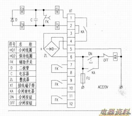 真空接触器在结构上为上下布置方式,由真空灭弧室、绝缘框架、绝缘子、拍合式合闸电磁机构、机械锁扣机构(机械保持方案用)和底板等组成。绝缘子、绝缘框架实现高压回路对地及桕问的绝缘和支撑。控制回路由桥式、合闸线圈、分闸线圈(机械袁1CKC3系列交流高压真空接触器的产品技术参表3JC25-7.2/12型高压真空接触器主要技术参数保持方案用)、保持线圈(电保持方案用)、辅助开关及器等组成,接线圈见上图(电保持方案)和图4(机械保持方案)。其中,对于电保持方案,保持线圈与合闸线圈串联用以实现接触器长期合闸保持,而电容器用来消除辅助开关常闭触点转换合闸回路时的电火花,从而提高辅助开关常闭触点转换合闸回路的稳定性和可靠性。当接到合闸指令时,即按压合闸按钮ON后,交流110V或220V经桥式整流加到合闸线圈两端,合闸线圈通电,衔铁动作,使与其固定连接的方轴旋转,固定在方轴上的拐臂向上推动绝缘子,带动灭弧室动导电杆向上运动,接触器合闸。合闸后常闭辅助触点FK断开,保持线圈HQ2串人,合闸状态得以保持。对于机械保持方案,合闸保持由机械锁扣来实现。相反,接到分闸指令,即按压分闸按钮OFF后,分闸线圈TQ(产品资料中使用的符号.下同)通电(见下图).机械锁扣机构解扣;或保持线圈HQ2回路断电(见上图),由分闸弹簧作用使衔铁释放,方轴通过拐臂和绝缘子带动灭弧室动导电杆向下运动,接触器分闸。