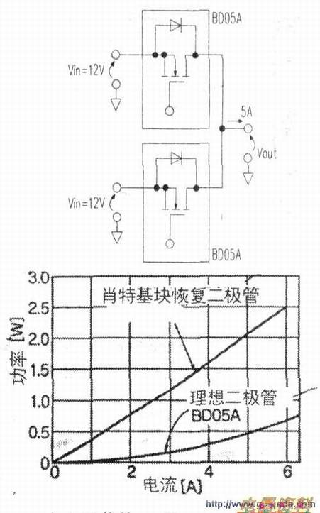 由于功率MOSFET的导通已低至数mΩ以下,其压降是导通+j流过的乘积,故理想二极管的功率损失非常小。下图是理想二极管和普通二极管的功耗曲线。理想二极管通常不需驱动,不会产生振荡等不稳定现象。