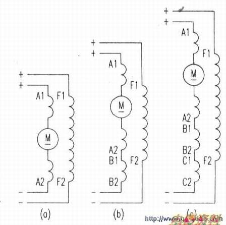 他励式电机的最大优点是有很好的硬机械特性,即由空载到满载其转速下降仅为额定转速的5%,10%。因此,它常作发动机的启动电机。但它也有一个弱点,励磁绕组不能断路,即不能失磁。否则励磁电流为零,主磁极只有微弱剩磁,此时电枢绕组的反很小,通过电枢绕组的电流将会很大,以致超过安全限度,从而将电枢绕组烧毁。为防万一,这类电机应安装失磁保护装置。在此顺便说明,在下图(a)、(b)、(c)3种接线方式中(下同)以图(c)最好。这是因为图'(c)中电枢绕组串接了补偿线圈,它能有效消除气隙磁场畸变和改善换向。从而保证了转速的相对平稳。