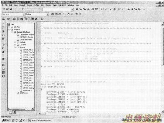 mposerStudio)是TI公司开发的一个完整的DSP集成开发环境。由于TI的DSP使用非常广泛,使得CCS也就成为使用最为广泛的DSP开发软件之一。现在,所有TI公司的DSP都可以在该环境里进行开发,可实现全空间透明仿真,不占用用户任何资源,软件配有汇编/链接、C编译器、C源码调试器等。不同的系统有不同版本的CCS开发环境,TMS320F28l2的集成开发环境是CCS2000。在购买开发板时都会免费赠送CCS开发软件,另外也可以在TI的网站上免费下载该软件,开发环境的安装使用一般在DSP开发板的使用说明书中有详尽的叙述,在此不做赞述。开发软件的界面如下图所示。
