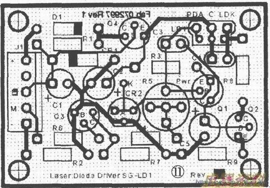 这个设计以为,激光二极管组件中的激光二极管阳极和阴极是共连的(这好像是最常使用的配置)。如果把你的器件反过来使用(激光二极管阴极和光敏二极管阳极共连),零部件极化和的输入,并且把npn变为管,反之亦然,仍然允许相同的印刷板使用。不过,激光二极管组件不仅阳极而且阴极都共连,这样的电路将不合适使用,除非有一外接光敏二极管用于光反馈。有时候,已列出的部分元件值被认为是作为建议,因为很多修改可能取决于你用的特别的激光二极管规格和应用需要。考虑过晶体管Q2和Q4的散热器,如果器件连续在输入的顶端附近操作,比如说超过10V,和,或有100mA或者更高的激光二极管工作,晶体管Q2和Q4就要加装散热器。