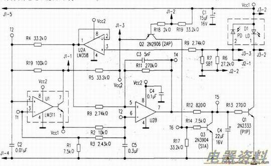反馈环由(Dl的PD部分),一非倒相的(U2A),倒相的放大器,低通(U2B,R9.Rll,C3,组成大约l千赫的带宽),以及射随恒流源(Ql,R13,R14.其有36mA/V的灵敏度)等组成,用以驱动这个激光(Dl的LD部分)。