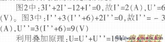 例1:使用叠加原理分析图1电路中的U图1中有两个独立源,12V电压源与6A电流源,其分别单独作用的电路如图2与图3,在这两图中受控电压源在电路中的位置不变,其受控量I跟随控制支路的改变而改变.