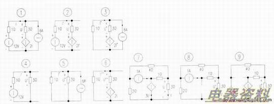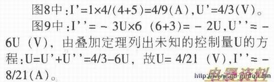 图7中含有两个电流源:lA的独立电流源,电压控制的受控电流源,其分别作用的电路如图8与图9。