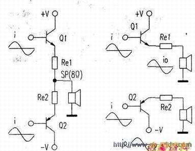 推挽式甲类功放,可以看成是由2个单管式甲类射极器组成。