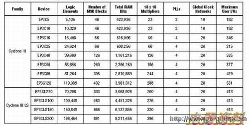 主要Cyclone III系列器件都有2或者4个,每一个PLL有最多5个不同的输出。主要Cyclone III系列器件的资源情况如表2。