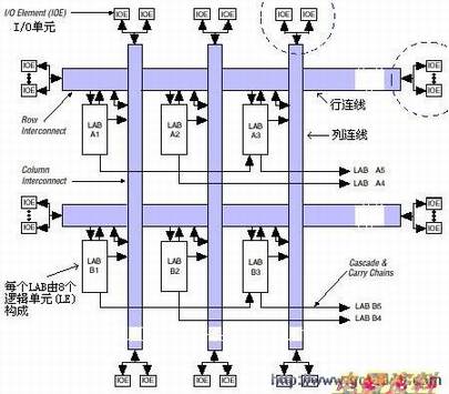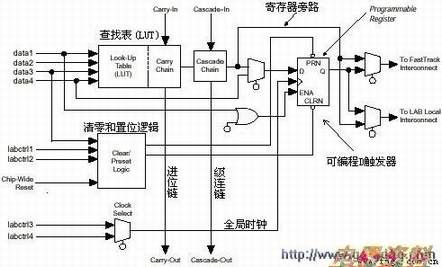 逻辑单元(LE)内部结构为:FLEX/ACEX的结构主要包括LAB,I/O块,RAM块(未表示出)和可编程行/列连线。在FLEX/ACEX中,一个LAB包括8个逻辑单元(LE),每个LE包括一个LUT,一个和相关的相关逻辑。LE是FLEX/ACEX芯片实现逻辑的最基本结构 ( Altera其他系列,如APEX的结构与此基本相同,具体请参阅数据手册)