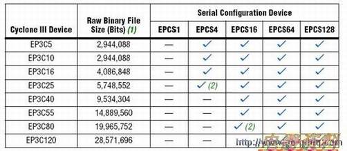 如果配置时间不是敏感的,Cyclone III的配置芯片可以选择串行配置器件EPCS系列。如下表所示