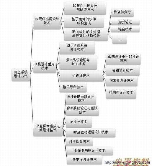 在多数情况下,一个片上系统的设计并不是从头开始的,而是使用积累的已有IP核或者购买第三方IP核。片上系统设计方法学正是围绕片上系统的上述内容展开的。片上系统设计方法学具体包括软硬件协同设计技术、IP核的设计复用技术、以及深亚微米设计技术,如下图所示。