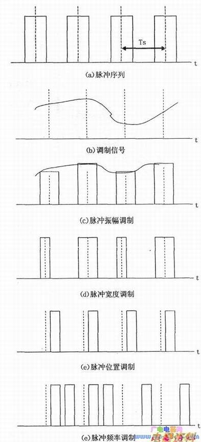 脉冲调制的载波不是正弦波,而是性的离散脉冲序列,如下图(a)所示。脉冲的波形参数有4个:脉冲振幅E、脉冲宽度t、脉冲位置以及脉冲重复频率fs(即重复周期Ts的倒数)。若用调制信号控制上述4个参数中之一使之发生变化,则可得到4种基本的脉冲调制方式:脉冲振幅调制(PAM,PulseAmplitudeModulation)、脉冲宽度调制(,PulseWidthModulation)、脉冲位置调制(PPM,PulsePositionModulation)和脉冲频率调制(P,PulseModulation)。在下图中,(b)是调制信号,(c)、(d)、(e)、(f)分别是这4种脉冲调制波形,下图中垂直虚线表示未调制脉冲序列中每个脉冲的位置,即参考位置。