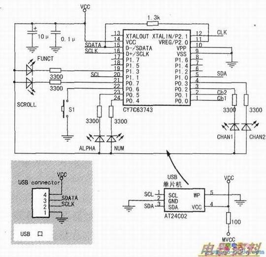鼠标运动和按键等信息被接收器的天线接收下来,并通过射频接收模块的处理后经由USB单片机输入单片机的USB口。接收器的电路图见下图。