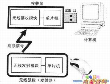而接收器的结构相对简单一些,如下图所示。接收器的核心仍然是单片机,该单片机与中图中的单片机不同,它具有与计算机USB口进行接口的本领,这类能与USB口通信的单片机称为USB单片机。