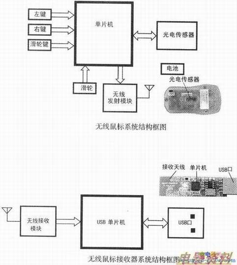 在无线鼠标上,除无线发射模块以外,其他器件如左键、右键、滑轮键、滑轮、光电等都能从鼠标表面找到。结合上图所示的无线鼠标结构,可以规划系统结构框图如中图所示,单片机为系统的核心,6个模块都在单片机的控制下工作,电池向整个系统提供工作。
