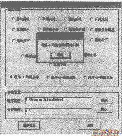 键值设定对话框设置时先设定配置文件的保存位置,软件默认保存在C盘根目录下面,若更改设置保存位置后需单击“保存设置”保存路径设置更改,提示“配置文件保存成功”即更改成功。配置文件名为软件默认文件名“IRconfig.ini”,配置时选择对应的功能项,然后使用遥控器按下定义的对应功能键,则对应的定义键为对应的功能。如选择键盘功能区的启动关机项,将下位机设置为学习模式后按下遥控器的键“1”,等待弹出提示对话框“启动关机添加成功!”,则“1”键被设置为关机键,退出学习模式后按下遥控器端的“1”键可启动关机操作。继续选择键盘功能区的其他功能项可继续类似的添加功能键定义。
