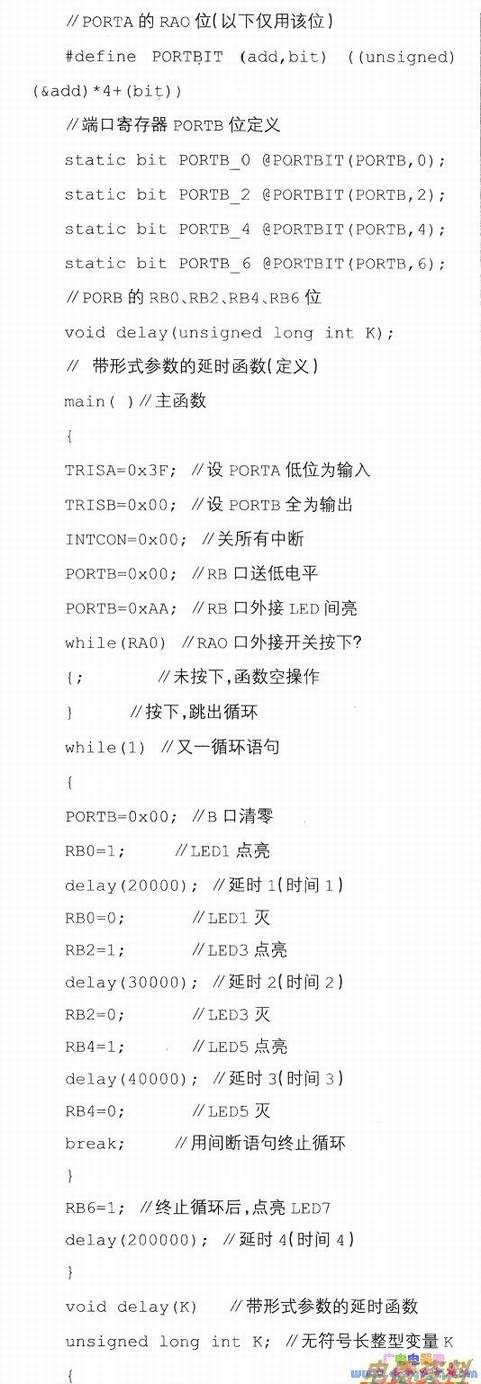 读者学习C语言时,一定要将实例2源程序中的关键字"break"分别用"corltinue"和“return”代换并运行程序,同时观察使用三种不同的关键字时LED指示灯的不同状态,方能体会出三者的差异。