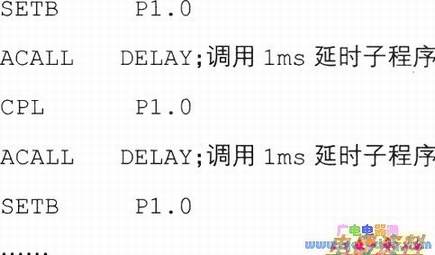 我们先给P1.0置位输出高.延时1微秒后再把P1.0清零输出低电平,然后再延时1微秒后,又一次把P1.0置位,依次重复,就可在P1.0输出是2微秒的方波。因为它的频率是500赫兹,接近低音7的频率,这样P1.0就能演奏音乐了。
