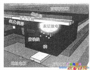 显示器内部结构如图所示。由于等离子显示器是采用直位式放电激发荧光位发光束控制灰度变化的,以气体放电的方法来进行控制的。因此,制造厂商可通过调整放电体的混合比及气体最佳比来提高亮度。