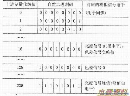 8位二进制码共有256个彼此不同的8位二进制码字,可分别分配给8bit精度的256个量化值。但考虑到可能有幅度超过正常范围的信号,以及有些码字还要留作它用等原因,相关标准规定,这256个码字并不都分给编码图像信号使用,它们与十进制表示的量化级及模拟图像信号电平的对应关系如下表所示。