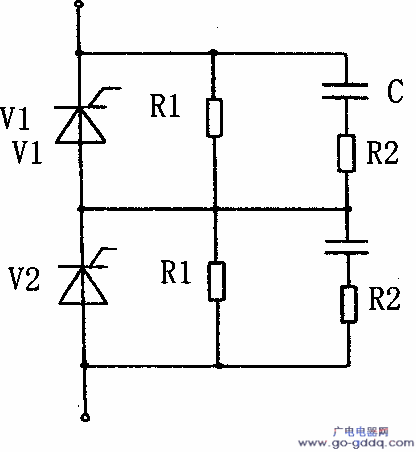 晶闸管串联时,由于漏不同,导致阻断状态时串联运行的各晶闸管承受的不均匀,因此必须采取均压措施,可以在器件上并联均压。另外,还有一个动态均压问题。当关断时,由于串联的各个晶闸管关断时间不一致,其中最先关断的一个将会单独承受全部反向电压而导致。所以在每个晶闸管上需并联阻容均压环节,利用两端电压不能突变的特点来使各个管子承受的瞬间反向电压均匀起来,如图所示。